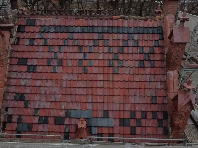 Okazało się, że położone dachówki ceramiczne są podwójnego koloru - czerwonego i czarnego, z których czarne tworzą powtarzający się wzór trójkątów.